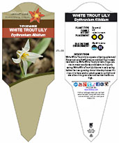 The MIROFOSS database offers free printable garden tags for personal and non-profit use. These tags can be used to properly identify plant samples in a garden. Click on the tags shown on the the screen or -click here- to download a full size jpeg image for a white trout lily lily identification tag; which can be printed on paper or used with a plastic laser printer. |